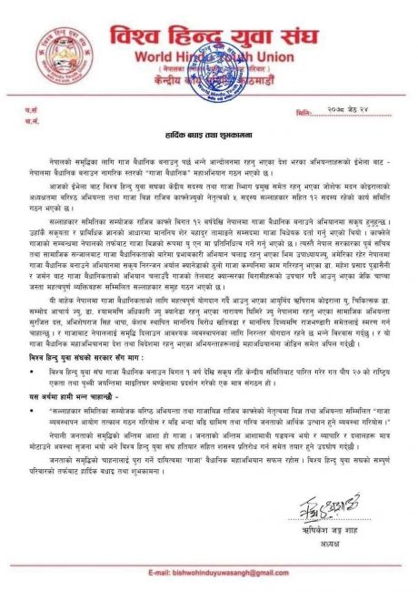गाजा खेतीलाई वैधानिक बनाउन देशभरका अभियान्ताहरुको मंगलबार बसेको भर्चुअल भेलाबाट नेपालमा गाँजा खेतीलाई वैधानिकता बनाउनुपर्छ भन्ने महाअभियान गठन भएको भएको विश्व हिन्दु युवा संघका अध्यक्ष ऋषिकेश जंग शाहले बताए।
