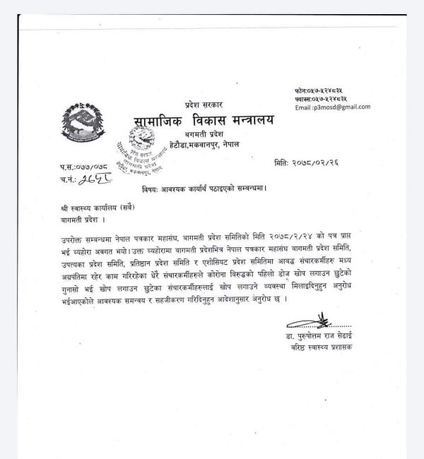 नेपाल पत्रकार महासंघ बागमती प्रदेश समितिले जेठ २४ गते काटेको पत्र प्राप्‍त भएकाले बागमती प्रदेशभित्र कार्यरत सञ्चारकर्मीलाई खोप लगाइदिने व्यवस्था मिलाइदिन मन्त्रालयका वरिष्ठ स्वास्थ्य प्रशासक डा। पुरुषोतम सेढाइले बताएका छन्।