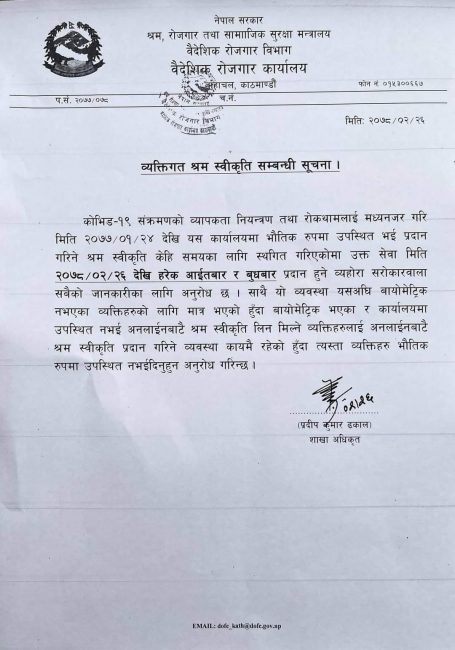 कोरोना संक्रमणको नियन्त्रण तथा रोकथामलाई मध्यनजर गर्दै कार्यालयले भौतिक रुपमा उपस्थित भएर लिनुपर्ने सेवा केहि समयको लागि बन्द गरेको थियो । र, अनलाइनमार्फत श्रम स्वीकृति लिने व्यवस्था गरिएको थियो ।