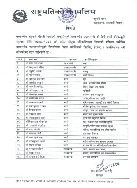 प्रधानमन्त्री ओलीले आज खगराज अधिकारी गृह, राजकिशोर यादव उद्योग बाणिज्य तथा आपूर्ति, नैनकला थापा सञ्चार सूचना तथा प्रविधि, ज्वालाकुमारी साह कृषि तथा पशुपन्छी विकास, नारदमुनी राना वन तथा वातावरण, गणेशकुमार पहाडी संघीय मामिला तथा सामान्य प्रशासन, मोहन बानियाँ प्रधानमन्त्री तथा मन्त्री परिषदको कार्यालय र आशाकुमारी विक राज्यमन्त्री वन तथा वातावरण नियुक्त गरेका थिए।