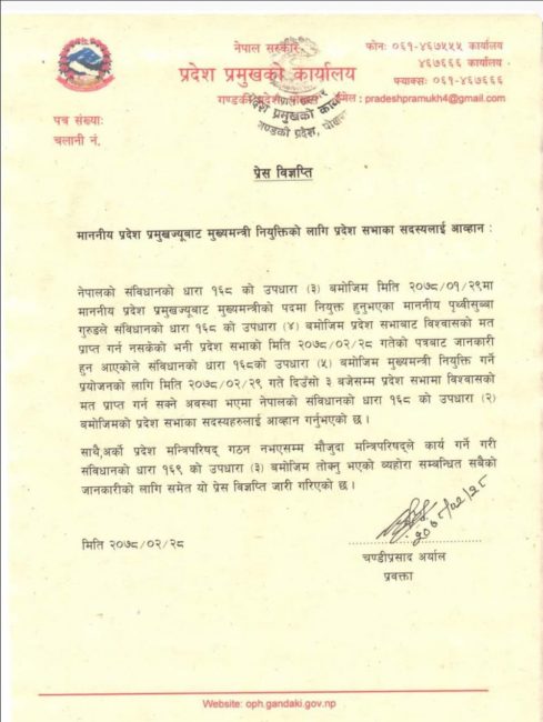 गण्डकीमा सरकारका बनाउनका लागि दावी पेश गर्न आव्हान