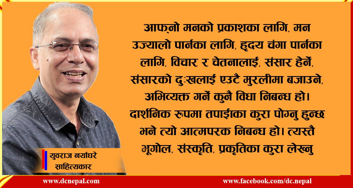 नेपाली निबन्ध र नियात्रामा आफ्नो जीवन समर्पण गरेका र बाँकी जीवन पनि नियात्रा र निबन्धकै लागि दिन लागेको उनै साहित्यकार युवराज नयाँघरेसँग डिसी नेपालका लागि तर्कबहादुर थापाले गरेको कुराकानीको सम्पादीत अंशः