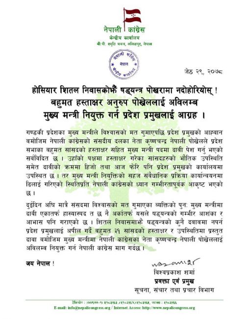 काँ्रेसले अगाडि भनेको छ, ‘दुईदिन अघि मात्रै संसदमा विश्वासको मत गुमाएका ब्यक्तिको पुनः मुख्यमन्त्रीमा दावी एकातर्फ हास्यास्पद त छ नै अर्कातर्फ यसले षड्यन्त्रको गम्भीर आशंका र आभास पनि गराएको छ। शीतल निवासमा झैं षड्यन्त्रको कुनै दबाबमा नपर्न प्रदेश प्रमुखलाई अपील गर्दै बहुमत ३१ सांसदको हस्ताक्षर र उपस्थितिमा प्रस्तुत दावा बमोजिम मुख्य मन्त्रीमा नेपाली कांग्रेसका नेता कृष्णचन्द्र नेपाली पोख्रेललाई अविलम्ब नियुक्त गर्न नेपाली कांग्रेस माग गर्दछ।’