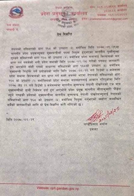 मुख्यमन्त्री नियुक्तका लागि आधार पेश गर्न आव्हान गरेपछि विपक्षी गठबन्धनको तर्फबाट पोखरेलले ३१ प्रदेशसभा सदस्यको हस्ताक्षरसहित दाबी पेश गरेका थिए। निवर्तमान मुख्यमन्त्री पृथ्वीसुब्बा गुरुङले पनि सरकार बनाउने दावी पेश गरेका थिए।