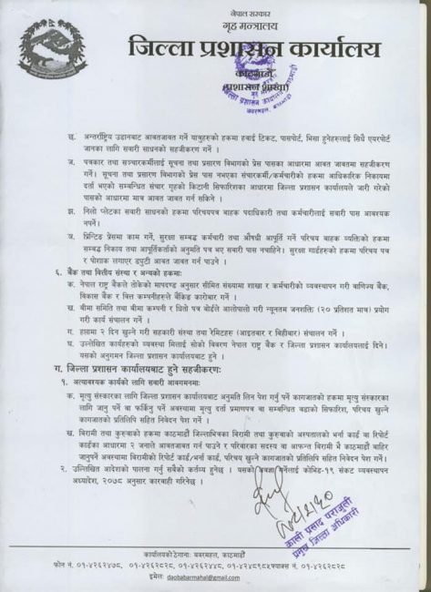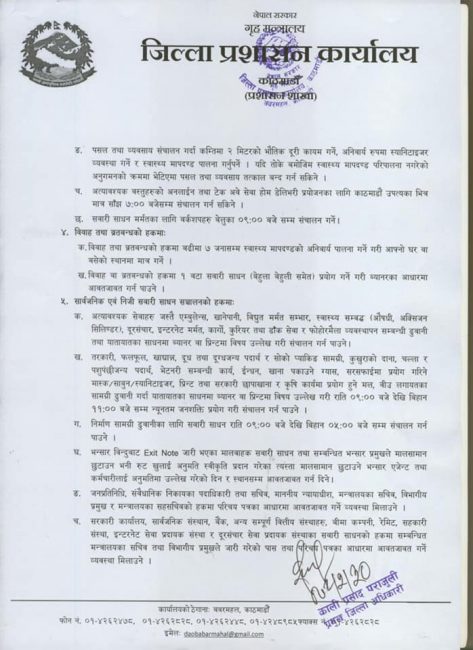 वैशाख १६ गतेदेखि पटक पटक गरि लागु गरिएको निषेधाज्ञाको अवधि सोमबार रातिबाट सकिन लागेको बेला उपत्यकामा तीनै जिल्लाका प्रजिअहरुको बैठकले निषेधाज्ञा पुनः एक साता थप गरेको हो। अबको निषेधाज्ञामा केही परिमार्जन समेत भएको छ।