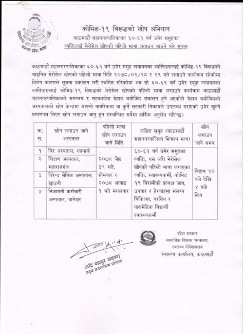 वडा वडामा भिडभाड बढेकाले अस्पतालमा खोप लगाइने महानगरका स्वास्थ्य सेवा विभागका प्रमुख हरि कुँवरले जानकारी दिए। उनका अनुसार जेठ ३१ देखि असार १ गतेसम्म खोप लगाइने भएको छ। वीर अस्पताल, सिभिल अस्पताल, त्रिवि शिक्षण अस्पताल र वीरेन्द्र सैनिक अस्पतालमा खोप लगाइने छ।