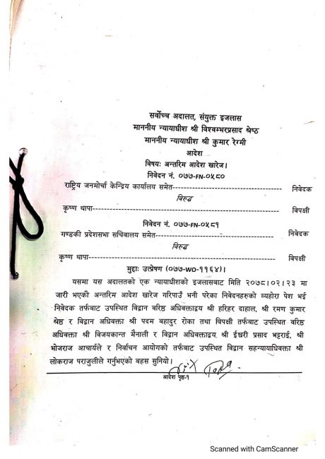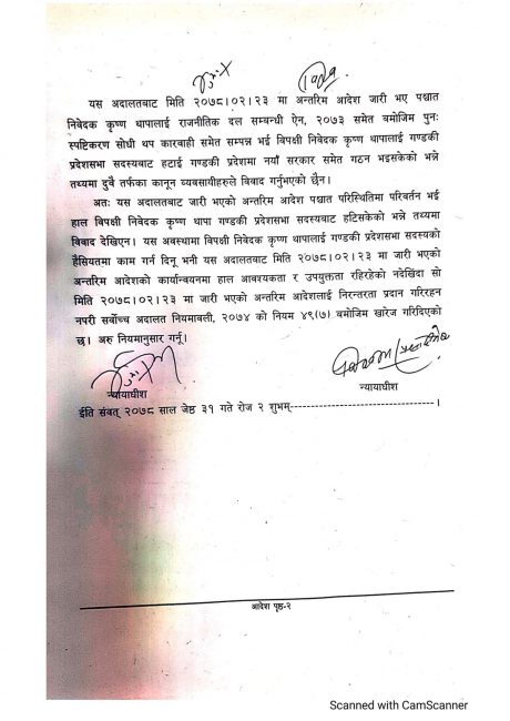 सर्वोच्चका न्यायाधीशद्वय विश्वम्भरप्रसाद श्रेष्ठ र कुमार रेग्मीको संयुक्त इजलासले अदालतबाट अन्तरिम आदेश जारी भएपश्चात परिस्थितिमा परिवर्तन भइ हाल विपक्षी निवेदक थापा गण्डकी प्रदेशसभा सदस्यबाट हटिसकेको भन्ने तथ्यमा विवाद नदेखिएको उल्लेख गरिएको छ।