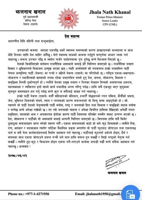 काठमाडौं। नेकपा एमालेका वरिष्ठ नेता तथा पूर्व प्रधानमन्त्री झलनाथ खनाललाई थप उपचारका लागि दिल्ली लगिएको छ। तीन दिनदेखि थापाथलीस्थित नर्भिक अस्पतालमा उपचाररत खनालको स्वास्थ्यमा सुधार नआएपछि दिल्लीस्थित एपोलो अस्पताल लगिएको हाे।