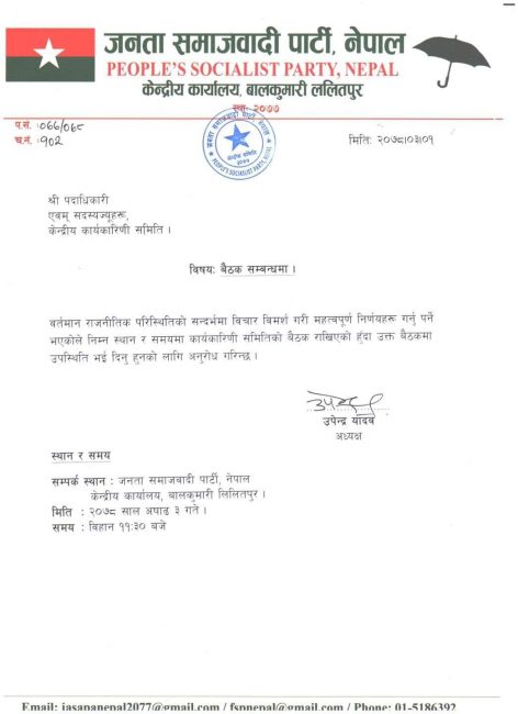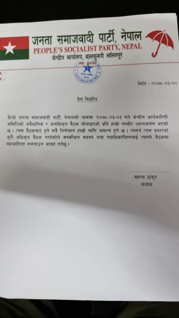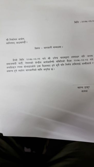 ‘हिजो मिति २०७८–०३–०१ गते श्री उपेन्द्र यादवद्वारा हस्ताक्षर गरी जनता समाजवादी पार्टी, नेपालको केन्द्रीय कार्यकारिणी समितिको बैठक २०७८–०३–०३ अनाधिकृत रुपमा बोलाएकाले उक्त बैठकबाट हुने कुनै पनि निर्णय हामीलाई अस्वीकार्य हुने र अमान्य हुने व्यहोरा जानकारीका लागि अनुरोध छ,’ ठाकुरले निर्वाचन आयोगलाई लेखेको पत्रमा भनिएको छ।