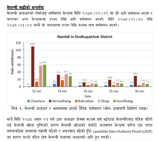 पहिरो गरेको समयमा केही समय मेलम्ची नदीमा पानीको बहाब घटेकोसमेत विभागले जनाएको छ। तर, ड्याम फुटेपछि भने बाढी आएको बताएको छ। सोही समयमा भारी वर्षा भएकाले पनि बाढी झन ठूलो भएको विभागले जनाएको छ। विभागले दिएको जानकारी अनुसार यदि नदीको वहाब कम भएको समयमा सही सूचना पाउन सकिएको भए मानवीय क्षति कम हुन सक्ने देखिएको छ।