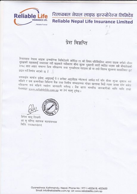 रिलायबल इन्स्योरेन्सले असार मशान्तसम्म बिलम्ब शुल्क शतप्रतिशत छुट दिने