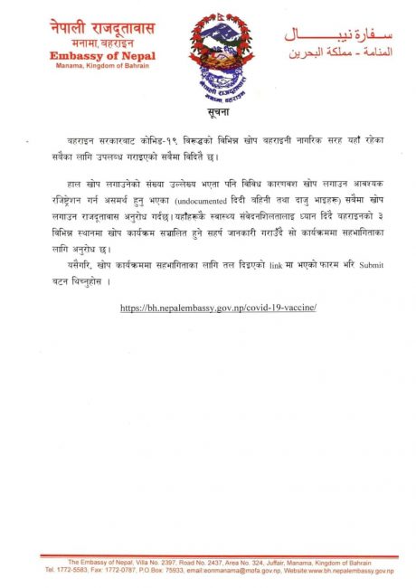 बहराइनमा रहेका नेपालीलाई खोप लगाउन आह्वान