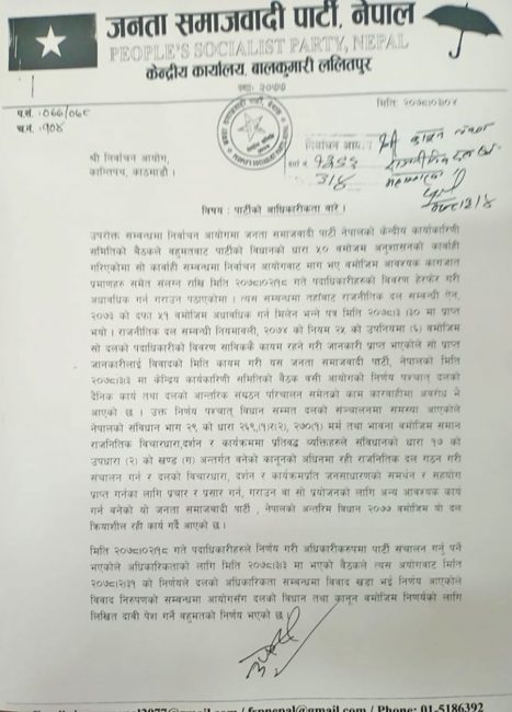तर, निर्वाचन आयोगले जेठ ३० मा दुबै समूहका दावीलाई खारेज गरिदिएको थियो। आयोगले राजनीतिक दल सम्बनधी नियामवली ५१ बमोजिम विवरण अध्यावधिक गर्न नमानेपछि उपेन्द्र समूहले दफा ४३ बमोजिम पार्टीमा आधिकारिकता दावी गर्दै निर्वाचन आयोग पुगेको हो।