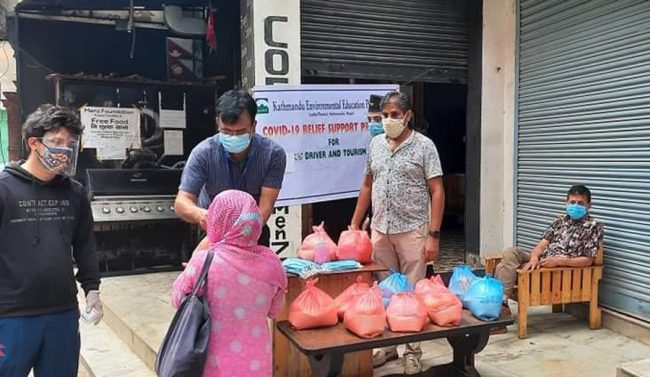 अध्यक्ष नहर्कीले भने, ‘कोरोना महामारीले करिब एक वर्षदेखि पर्यटन व्यवसाय ठप्प छ । कामबिहीन पर्यटन मजदुरलाई केही राहत होस् भनेर हामीले विभिन्न दाताको सहयोगमा खाद्यान्न सामाग्री बाँडेका हौं ।’