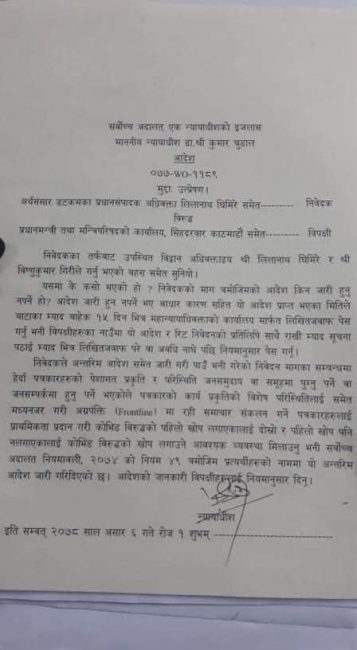 सर्वोच्चले प्रधानमन्त्री तथा मन्त्रिपरिषदको कार्यालयका नाममा आदेश दिएको हो। सर्वोच्च अदालतले पहिलो खोप लगाएका पत्रकारलाई दोस्रो र पहिलो खोप नलगाएका पत्रकारलाई पहिलो खोप उपलब्ध गराउन अन्तरिम आदेश जारी गरेको हो।