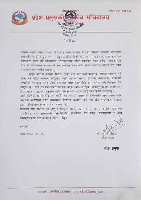 विज्ञप्तिमा भनिएको छ, “मुलुक कोरोना कहरको पीडामा रहेको बेला फेरि अर्को प्राकृतिक विपत्को सामना गर्नुपरेको छ, यस कठिन समयमा तत्काल पीडितका लागि आवास, खाद्य पदार्थ, लत्तकपडा र आवश्यक औषधिको प्रबन्धका लागि प्रदेश सरकारले विलम्ब नगरी विशेष प्राथमिकताका साथ काम गर्नेछ भन्ने विश्वास मैले लिएको छु ।”