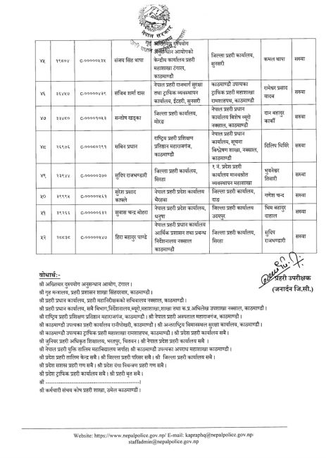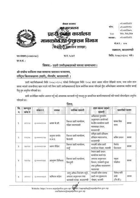 प्रहरी प्रधान कार्यालयले मंगलबार साँझ उनीहरुको सरुवा गरेको हो । प्रहरी महानिरीक्षकको मंगलबारको निर्णयअनुसार असार महिनादेखिको तलब भत्ता समेत हाल सरुवा भएको स्थानबाट खान मिल्ने गरी सरुवा गरिएको छ ।
