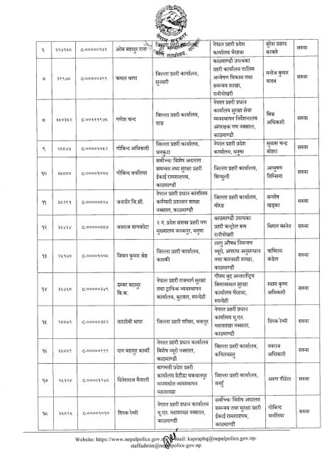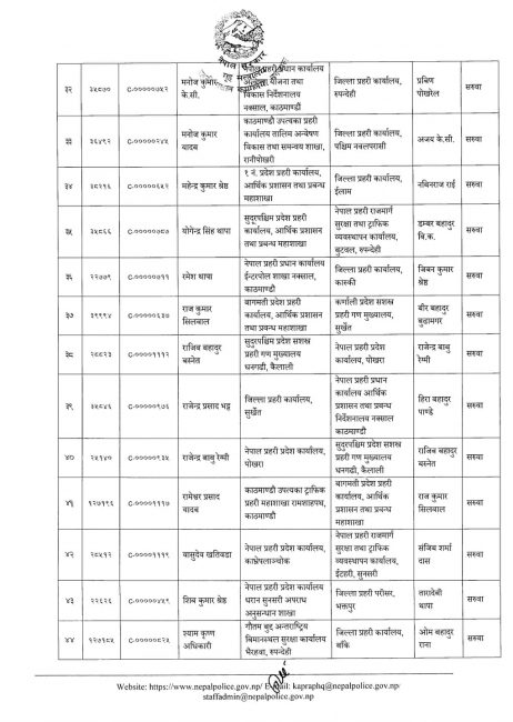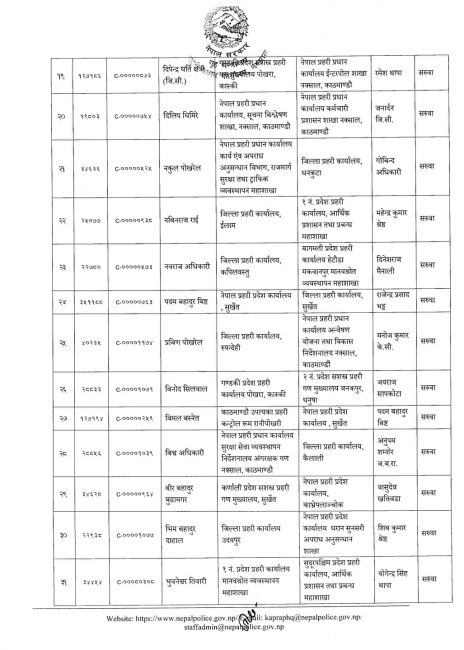 जिल्ला प्रहरी कार्यालय कास्कीमा रमेश थापा सरुवा भएका छन् । दानबहादुर कार्की जिल्ला प्रहरी कार्यालय कपिलवस्तु, श्यामकृष्ण अधिकारी बाँकेमा सरुवा भएका छन् । तारादेवी थापालाई भक्तपुरबाट प्रहरी प्रधानकार्यालयमा सरुवा गरिएको छ ।