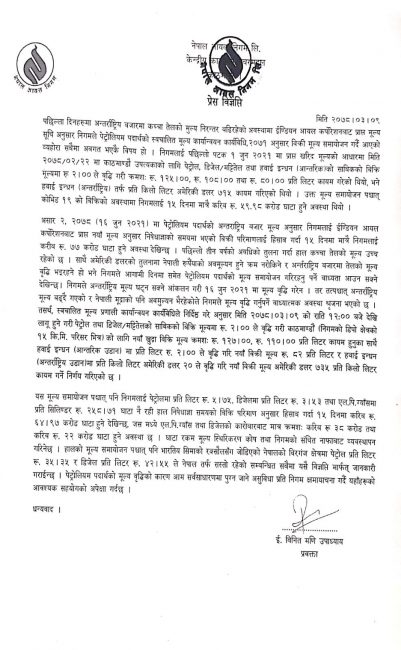 नयाँ मूल्य अनुसार पेट्रोलको मूल्य लिटरको १२७ रुपैयाँ र डिजेलको मूल्य ११० रुपैयाँ पुगेको छ। हवाई इन्धन (आन्तरिक उडान) मा प्रतिलिटर २ रुपैयाँले वृद्धि गरी ८२ रुपैयाँ प्रति लिटर र हवाई इन्धन (अन्तर्राष्ट्रिय उडान)मा प्रति किलोलिटर अमेरिकी डलर २ ले वृद्धि गरेर ७३५ डलर प्रति किलो लिटर बनाइएको छ।