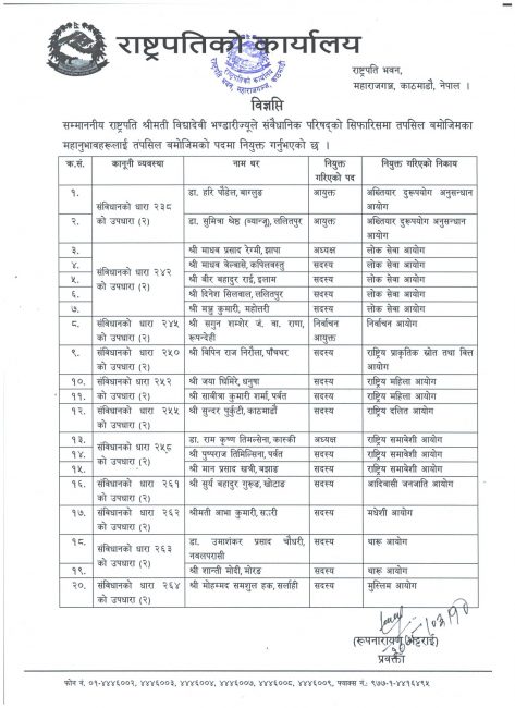 राष्ट्रपति भण्डारीद्वारा संविधौनिक निकायमा २० पदाधिकारी नियुक्त