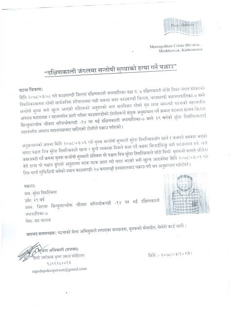 प्रहरीले विहीबार सुरेशले पत्रकार सम्मेलन गरी सार्वजनिक गरेको छ। प्रहरीले सुरेशलाई हिरासतमा राख्न जिल्ला अदालत काठमाडौंबाट अनुमति लिएर अनुसन्धान थालेको छ।
