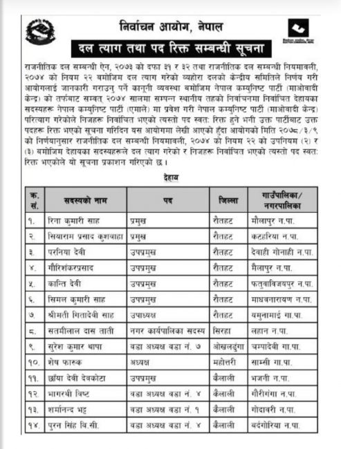 काठमाडौं। नेकपा माओवादीबाट गत स्थानीय निर्वाचनमा निर्वाचित भएर नेकपा एमालेमा प्रवेश गरेका १४ जना जनप्रतिनिधिको पद रिक्त भएको छ। निर्वाचन आयोगले एक सूचना जारी गरि १४ जनप्रतिनिधिको पद रिक्त भएको जानकारी दिएको हो।
