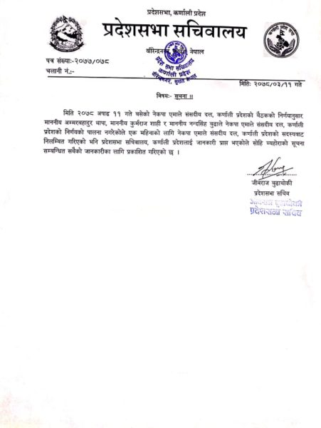 कर्णालीमा अनौठो र रोचक दृष्य देखिनेक्रम अझै जारी छ। प्रदेशसभा सचिवालयले शुक्रबार प्रकाशित गरेको एक सूचना अर्को अनौठो घटना बन्न पुगेको छ। एमाले संसदीय दलको निर्णय अनुसार सरकारमा मन्त्री रहेका एमालेका तीन सांसद अम्मरबहादुर थापा, कुर्मराज शाही र नन्दसिंह बुढालाई दलको सदस्यबाट एक महिनाका लागि निलम्बन गरिएको सूचना प्रदेशसभा सचिवलयका सचिव जीवराज बुढाथोकीले प्रकाशित गरे।