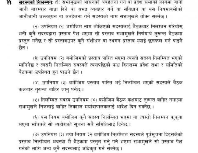 अब सांसद निलम्बन सम्बन्धी कर्णाली प्रदेशसभाका व्यवस्था हेरौं। कर्णाली प्रदेशसभा नियामवलीको परिच्छेद सातको दफा ३१ मा सांसद निलम्बन सम्बन्धी व्यवस्था छ। यसमा सभाको बैठक चलिरहेका बेला अवाञ्छित क्रियाकलाप गर्ने सांसदलाई सभामुखले बैठक कक्षबाट निष्कासन गर्ने र बढीमा १० दिन निलम्बन गर्ने तथा भएको भौतिक क्षतिको पूर्ति गराउने व्यवस्था छ। पार्टीले गरेको निर्णयका आधारमा सांसदलाई निलम्बन गर्ने व्यवस्था छैन।