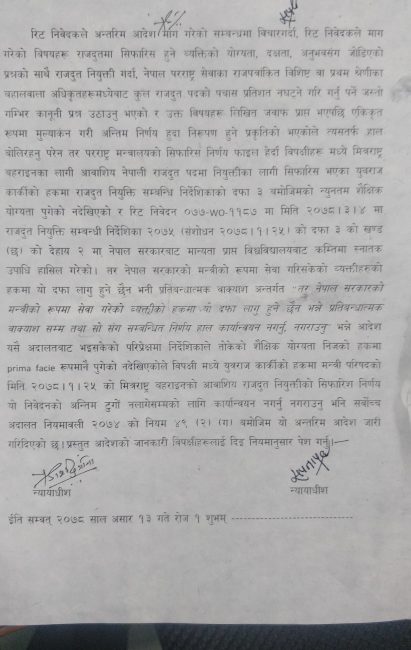 युवराज कार्कीलाई राजदूत नियुक्त नगर्न सर्वोच्चको आदेश