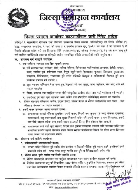 २५ सिट क्षमताभन्दा कम भएका सार्वजनिक सवारीसाधन चलाउन भने रोक लगाइएको छ । धेरै सिट भएका सवारीसाधनमा दुरी कायम राखेर यात्रुहरु ओहोरदोहोर गराउन पाइने छ । अन्य खाद्यान्न तथा उपभोग्य वस्तुका पसलहरु बिहान ११ बजेदेखि बेलुकी ६ बजेसम्म खोल्न दिने निर्णय भएको भक्तपुरका प्रमुख जिल्ला अधिकारी प्रेम प्रसाद भट्टराईले जानकारी दिए ।