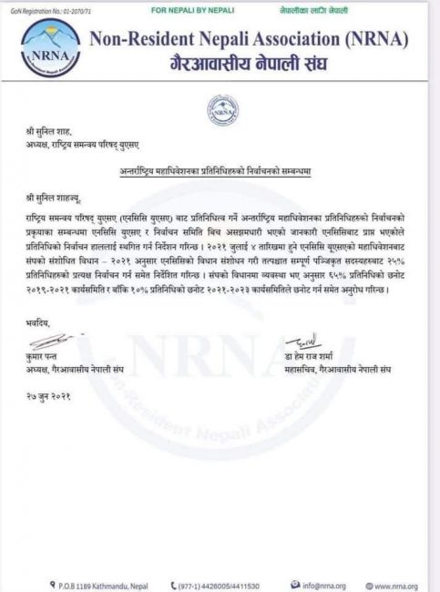 डेलिगेट निर्वाचन रोक्न एनसीसी अमेरिकालाई केन्द्रको निर्देशन(पत्रसहित)
