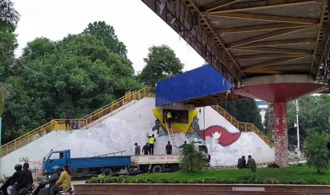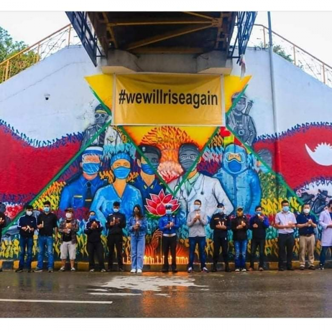 काठमाडौं। सात दिनको मेहेनेत र डेढ लाख रुपैयाँ लगानी लगाएर सात जना युवाहरुले रत्नपार्कको पुल मूनि चित्र बनाए। चित्रमा मास्क लगाएर काम गरिरहेका स्वास्थ्यकर्मी, सरसफाइकर्मी, प्रहरी, पाइलट, पत्रकार, शव व्यवस्थापकहरु देख्न सकिन्थ्यो।
