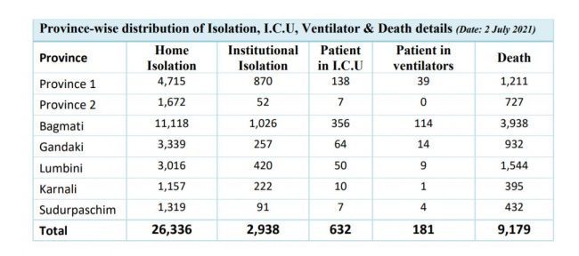मन्त्रालयका अनुसार हालसम्म २६ हजार ३ सय ३६ जना होम आइसोलेसनमा रहेका छन्। २ हजार ९ सय ३८ जना संस्थागत आइसोलेसनमा छन् भने ६ सय ३२ जना आइसीयू र १ सय ८१ जना भेन्टिलेटरमा रहेका छन्। वाग्मति प्रदेशमा सबै भन्दा बढी सक्रिय संक्रमित रहेका छन्। स्वास्थ्य मन्त्रालयका अनुसार होमआइसोलेसन, संस्थागत आइसोलेसन, आइसीयु र भेन्टिलेटर पनि अन्य प्रदेशको भन्दा वाग्मति प्रदेशको बढी रहेका छन्।