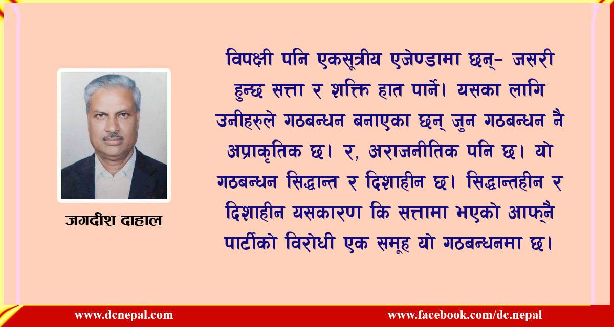 विपक्षी पनि एकसूत्रीय एजेण्डामा छन्– जसरी हुन्छ सत्ता र शक्ति हात पार्ने। यसका लागि उनीहरुले गठबन्धन बनाएका छन् जुन गठबन्धन नै अप्राकृतिक छ। र, अराजनीतिक पनि छ। यो गठबन्धन सिद्धान्त र दिशाहीन छ। सिद्धान्तहीन र दिशाहीन यसकारण कि सत्तामा भएको आफ्नै पार्टीको एक समूह यो गठबन्धनमा छ।