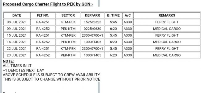खोपको पहिलो लट लिनका लागि नेपाल एयरलाइन्सको एयरबस ए ३३० जहाज यही असार २४ गते अपरान्ह बेइजिङ जानेछ र भोलिपल्ट बिहान काठमाडौं आइपुग्नेछ । यस्तै दोस्रो लट लिन ३१ असारको राती जानेछ र १ साउनका दिन दिउँसो काठमाडौं आउनेछ । यस्तै तेस्रो लट लिन साउन ७ गते राती जानेछ र साउन ८ गते दिउँसो काठमाडौं आइपुग्नेछ ।
