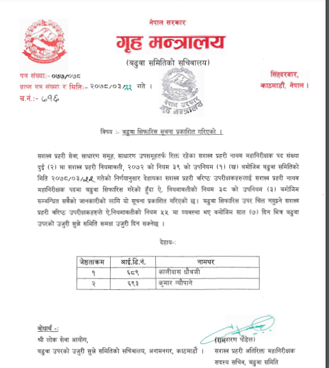 काठमाडौं । गृह मन्त्रालयले रिक्त रहेको डीआईजी पदका लागि सशस्त्र प्रहरीका एसएसपीद्वय कालीदास धौबजी र कुमार न्यौपानेलाई बढुवाका लागि सिफारिस गरेको छ ।