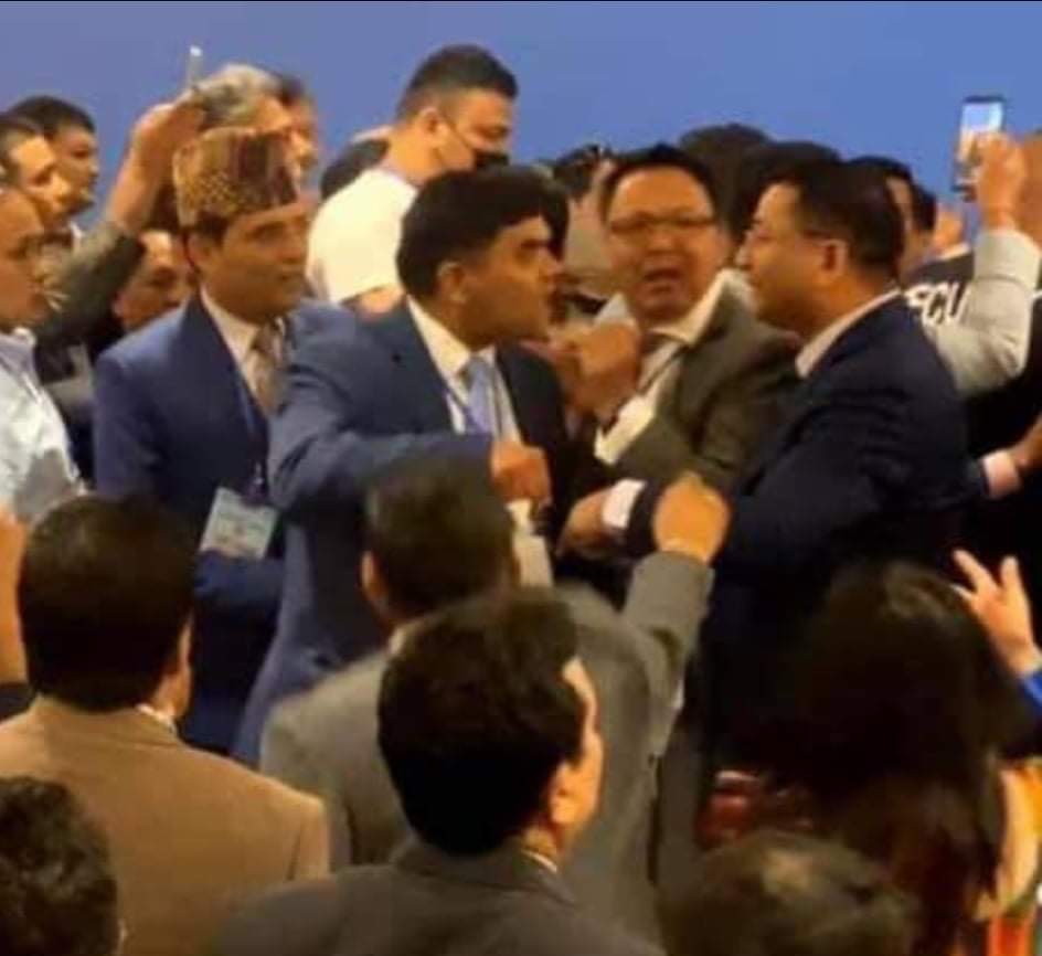 उनका तर्फबाट एकहुल मानिसहरु मञ्चमा उक्लिए अनि शुरु भयो भाँडभैलो। पौडेल आफैं आक्रोशित मुद्रामा मञ्चमा तथानाम भन्दै सुनिएका थिए भने उनको प्रतिकार साह समूह कमजोर सावित भएको थियो। लफडा चर्कंदै गएपछि संघको अन्तर्राष्ट्रिय समन्वय परिषद्का सचिव गौरी जोशी पनि मञ्चमा पुगेका देखिए।