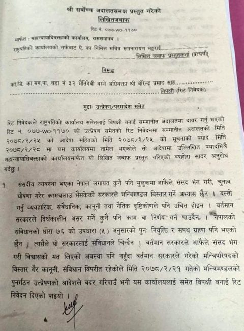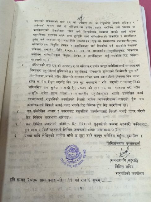 ‘संविधान बमोजिम कुनै निकाय वा पदाधिकारीको सिफारिसमा गरिने भनी किटानीसाथ व्यवस्था भएको कार्य बाहेक राष्ट्रपतिबाट सम्पादन गरिने अन्य जुनसुकै कार्य मन्त्रिपरिषद्को सिफारिस र सम्मतिबाट हुने व्यवस्था छ’ लिखित जवाफमा भनिएको छ– ‘जेठ २१ मा सम्माननीय राष्ट्रपतिज्यूबाट सिफारिस बमोजिम मन्त्रिपरिषद्मा नियुक्ति, हेरफेर र कार्यविभाजन गर्नु भएकोले रिट निवेदन बदरभागी छ ।’