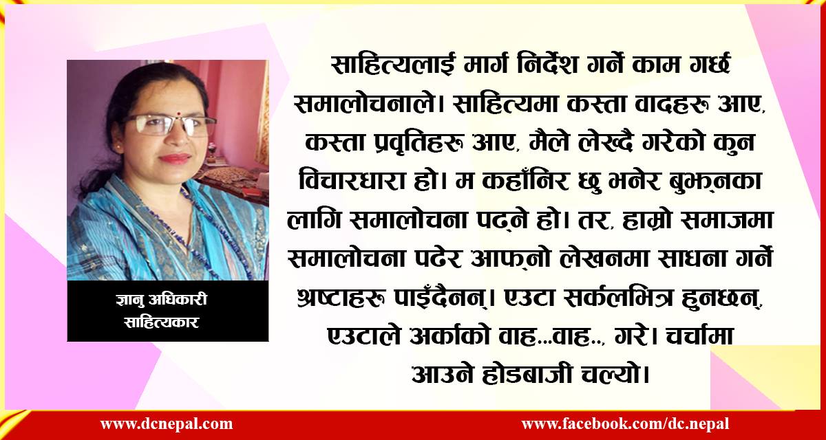 नेपाली साहित्यको समालोचनामा महिला समालोचकहरुको नाम कमै मात्र सुनिन्छ। तर, समालोचक ज्ञानु अधिकारी भने यो कुरालाई सुनाइएको बताउँछिन्। नेपाली साहित्यको समालोचक अधिकारी महिला समालोचकलाई लुकाइएको ठान्छिन्।