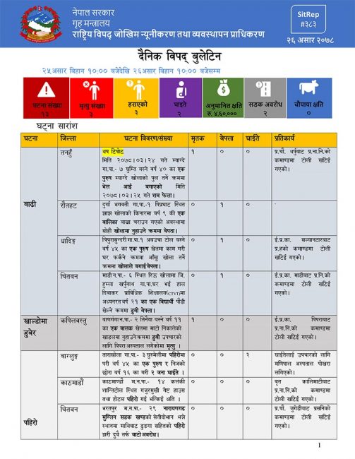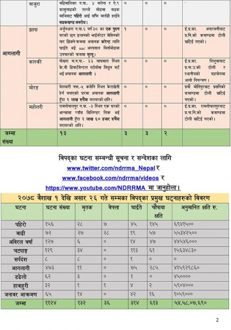 यस्तै आगलागीका ४७३ घटनामा ११ जनाको मृत्यु भएको छ। आगलागीका कारण ४१ करोड ५९ लाख २९ हजार ८६० रुपैयाँ बराबरको क्षति भएको छ। यस्तै जंगली जनावर आक्रमणका ६५ घटना भएका छन्। ती घटनामा परि हालसम्म १४ जनाको मृत्यु भएको छ।