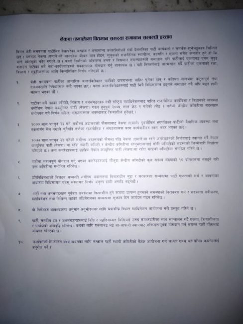 काठमाडौं। नेकपा एमालेको आन्तरिक विवाद समाधान गर्न गठन गरिएको सँयुक्त कार्यदलले आइतबार राति सहमति जुटाएको छ। कार्यदलले १० बुँदे सहमति गरेको छ। पार्टीको संरचनालाई जेठ २ गते पूर्वको अवस्थामा फर्काउने, विधान महाधिवेशन गर्ने, अन्य संरचना मिलाउन कार्यदल गठन गर्ने, माओवादीबाट आएकाहरुलाई केन्द्रीय सदस्य मनोनित गर्ने लगायतका १० बुँदे सहमति भएको छ।