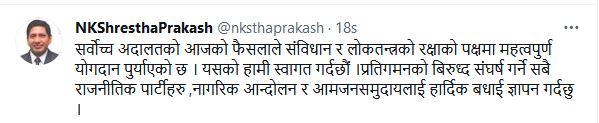 उनले भनेका छन्, ‘सर्वोच्च अदालतको आजको फैसलाले संविधान र लोकतन्त्रको रक्षाको पक्षमा महत्वपुर्ण योगदान पुर्याएको छ। यसको हामी स्वागत गर्दछौं।प्रतिगमनको बिरुध्द संघर्ष गर्ने सबै राजनीतिक पार्टीहरु ,नागरिक आन्दोलन र आमजनसमुदायलाई हार्दिक बधाई ज्ञापन गर्दछु।’