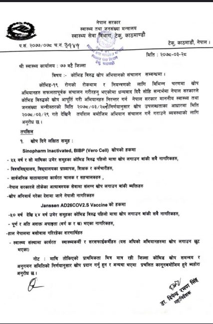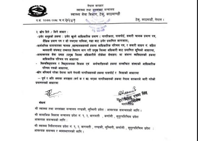 खोप लगाउन पहिचान खुल्ने सरकारी कागजात लिएर खोप केन्द्रमा जान मन्त्रालयले आग्रह गरेको छ ।