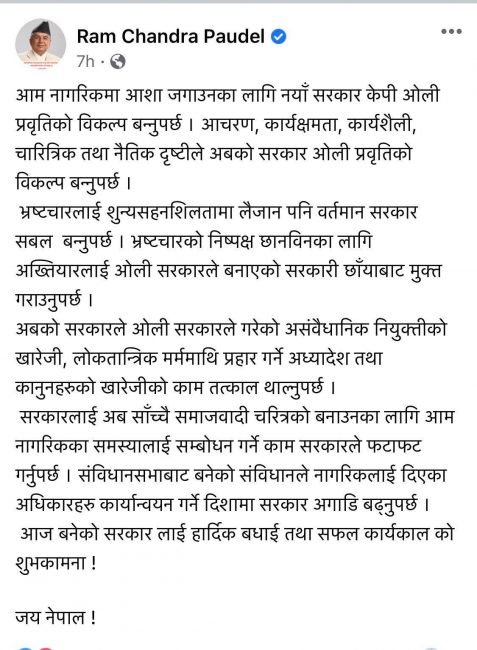 उनको यो अभिव्यक्तिले देउवा सरकार संसदलाई छलेर अध्यादेश ल्याउने पूर्व योजनामा रहेको संकेत दिएको छ । उनले लेखेका छन्, ‘अबको सरकारले ओली सरकारले गरेको असंबैधानिक नियुक्तिको खारेजीको काम तत्काल थाल्नुपर्छ ।’