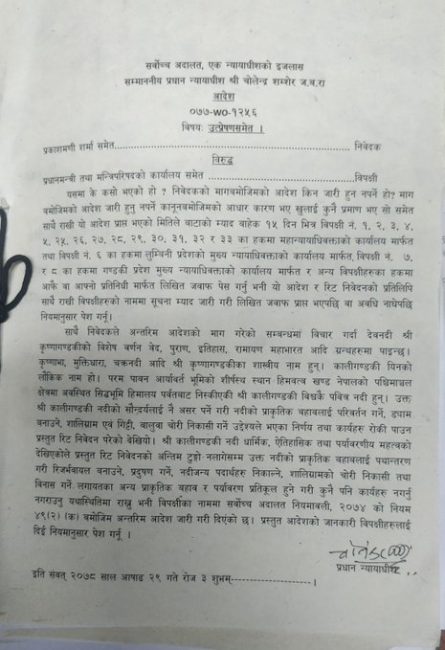 सर्वोच्चले कालीगण्डकी नदी धार्मिक, ऐतिहासिक र पर्यावरणी दृष्टिकोणले महत्वपूर्ण रहेको भन्दै यो रिटमाथिको अन्तिम फैसला नआउँदासम्म काम अगाडि नबढाउन भनेको छ। सर्वोच्चले कालीवण्डकी नदी विश्वकै पवित्र नदी भएकोसमेत सन्दर्भ उल्लेख गरेको छ।