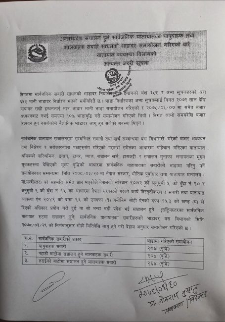 काठमाडौं। सरकारले सार्वजनिक यातायातको भाडा बढाएको छ। यातायातको भाडा ओली सरकारकै पालामा बढेको हो। यातायात व्यवस्था विभागले यही मंगलबार विभागको निर्णय अनुसार भाडा बढेको सूचना बुधबार सार्वजिक गरेको छ।