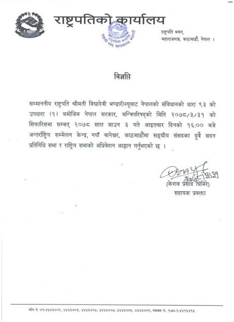 मन्त्रिपरिषदको विहीबार बसेको बैठकले संसद अधिवेशन आव्हानका लागि राष्ट्रपति समक्ष सिफारिस गरेको थियो। गत जेठ ८ मा विघटन गरिएको प्रतिनिधिसभाको अधिवेशन सर्वोच्च अदालतले बदर गरेपछि पहिलो पटक बोलाइएको हो।