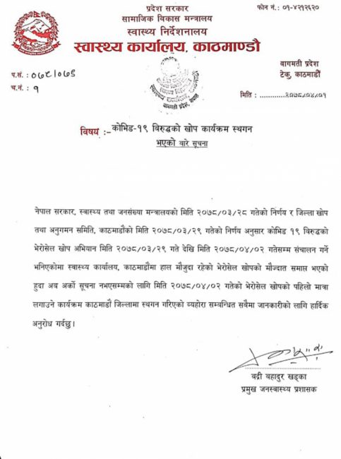असार २९ गते शुरु भएको खोप अभियान साउन २ गतेसम्म जारी राख्ने बताइएको थियो। तर, खोप नै सकिएपछि स्थगित गरिएको कार्यालयले जनाएको छ। अर्को सूचना नभएसम्मका लागि काठमाडौंमा खोप अभियान स्थगित गरिएको हो।