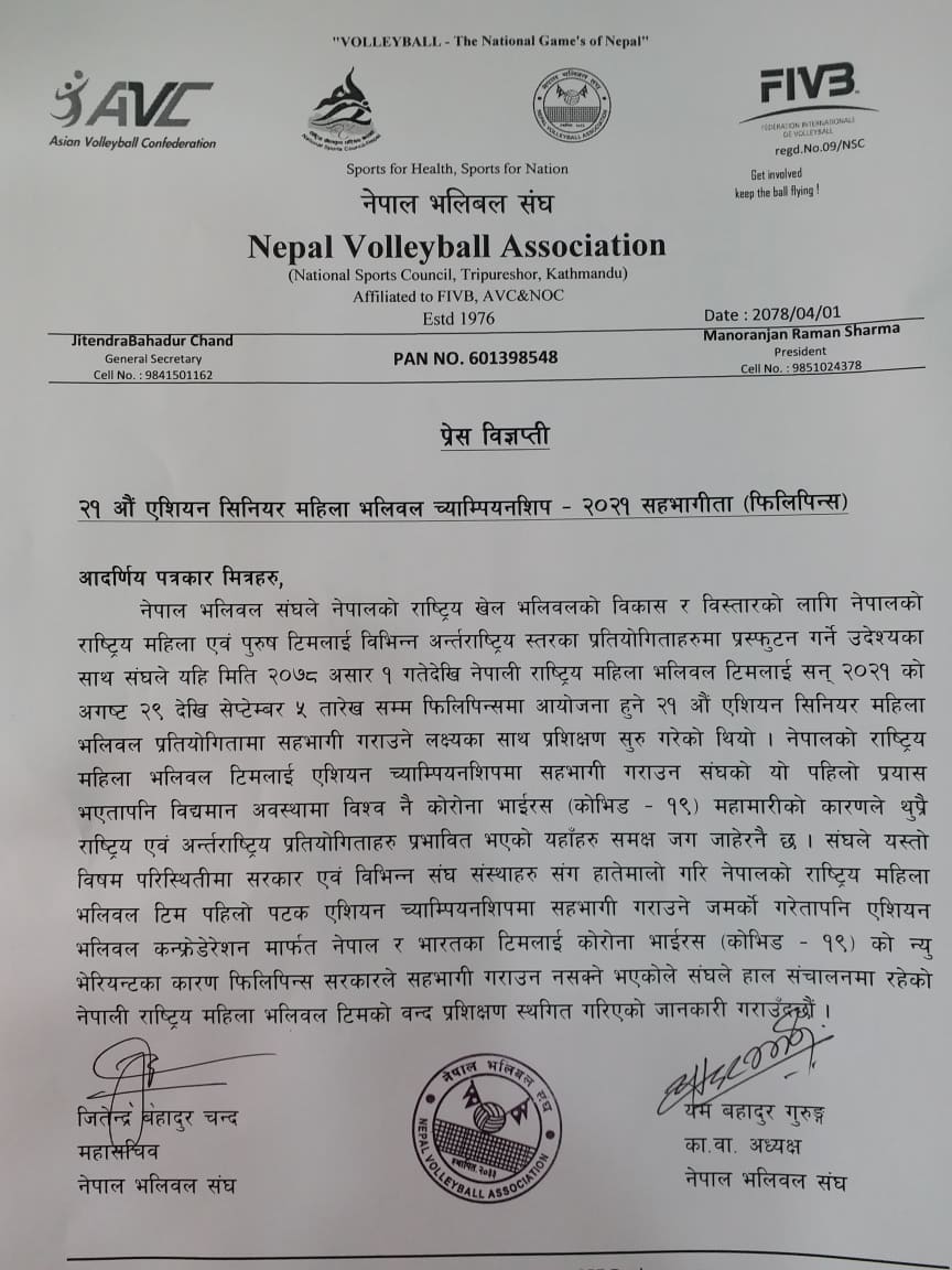 कोरोना कारण महिला भलिबल टोली एसियन च्यान्पियनसिपमा सहभागी हुन नपाउने