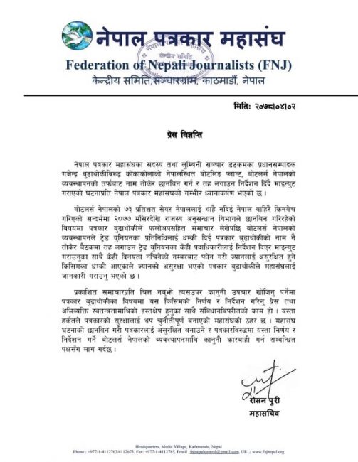 बोटलर्स नेपालद्वारा पत्रकार बुढाथोकीलाई धम्की, महासंघको आपत्ती
